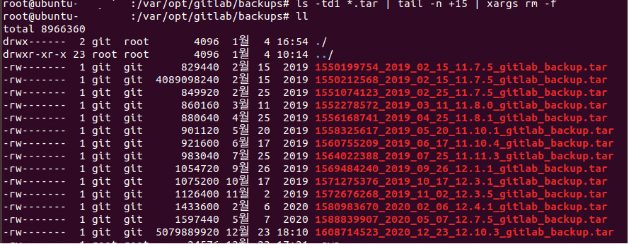 gitlab 백업 파일이 용량이 너무 많이 차지해서 정리가 필요하다.