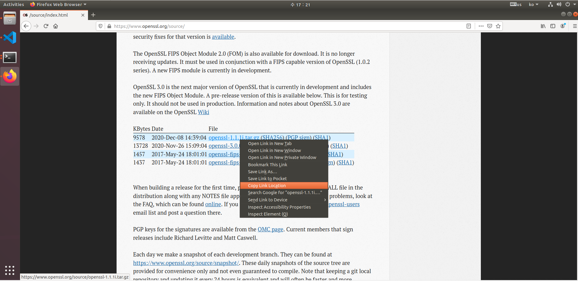 $ wget https://www.openssl.org/source/openssl-1.1.1i.tar.gz # openssl파일 다운로드