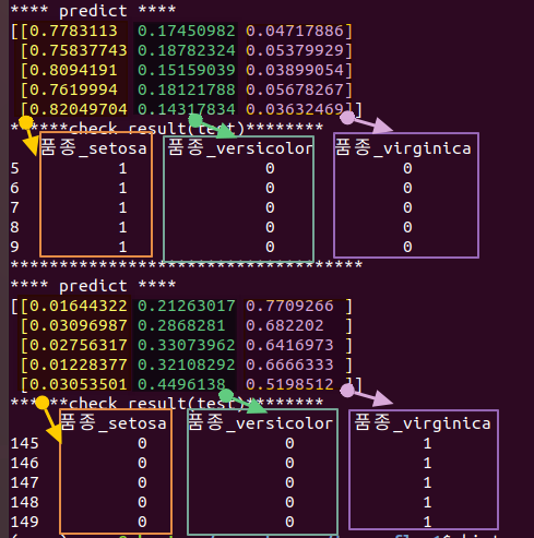 아래의 사진처럼, 예측한 값이 한 줄에 3개씩 출력되어, 값이 더 높은 값이 해당 품종으로 예측한 것이다.