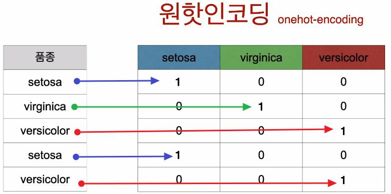 - 원핫인코딩은 범주형 데이터를 0과 1로 바꿔준다.