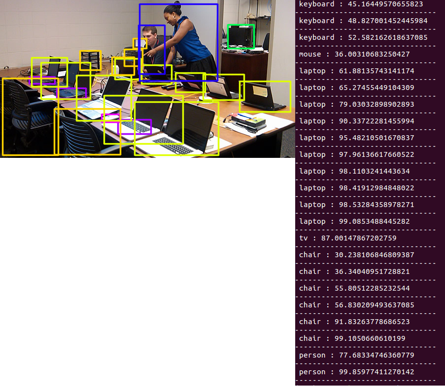 최소 정확도가 30% 이상, 정확도, 객체명을 출력하지 않았다. 다양한 옵션들을 조절하여, 결과를 뽑을 수 있다.