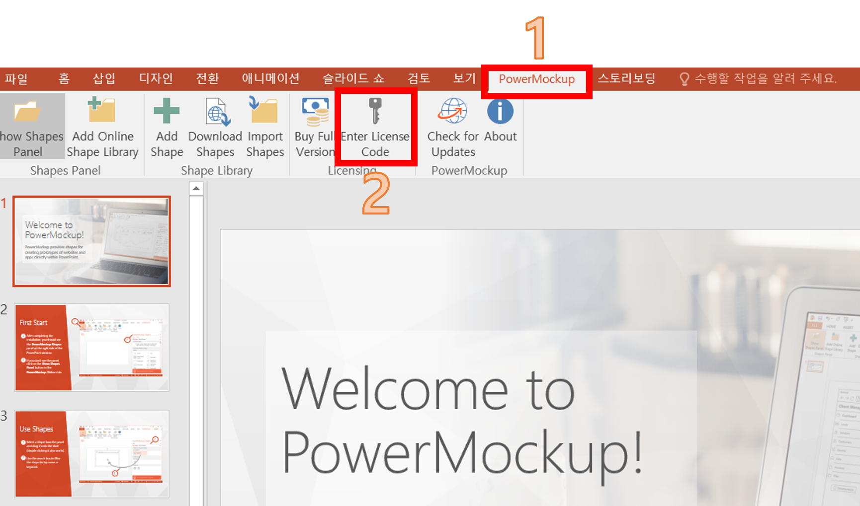 (1) 파워포인트(Power Point)를 실행하고 파워목업(PowerMockup) 탭 클릭