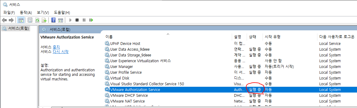 Vmware Authorization Service을 찾아, 실행 중인지 확인