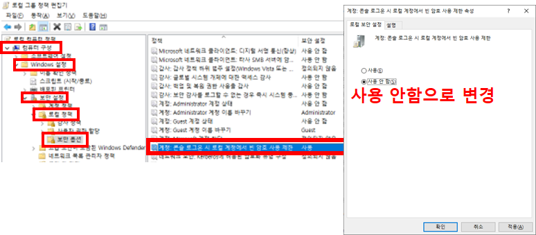- "계정 : 콘솔 로그온 시 로컬 계정에서 빈 암호 사용 제한 속성" 선택