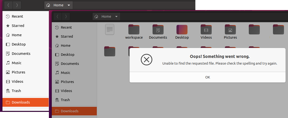 설치를 잘못했는지, 갑자기 Downloads파일을 선택하면 오류가 발생했다.