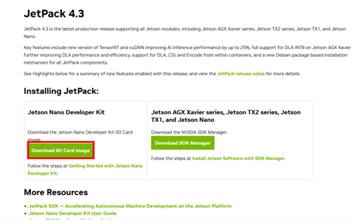 자신이 가지고있는 Jetson Nano 제품에 맞는 이미지를 다운로드 하시면 됩니다. 저는 JetPack 4.3버전이 필요하여 아카이브에서 다운로드 했습니다.