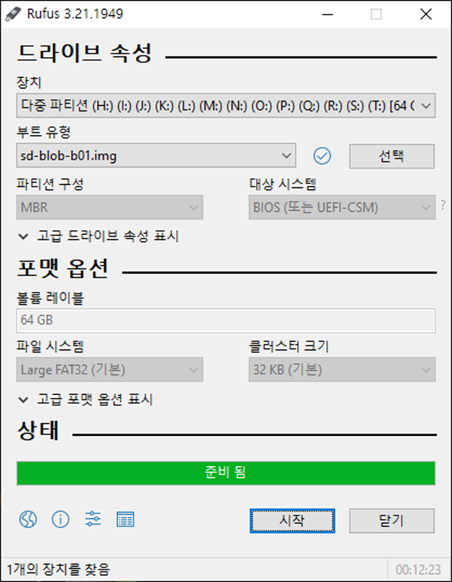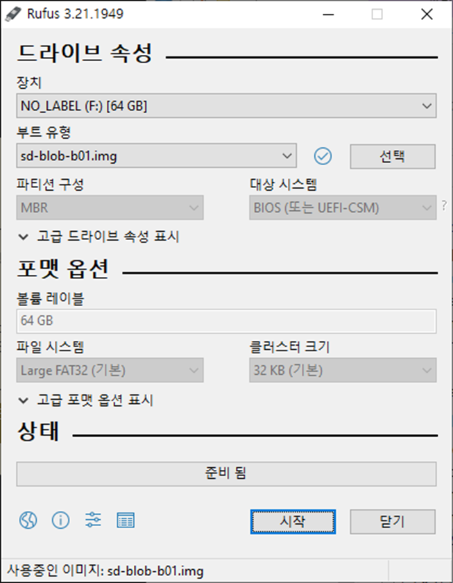 위에서 다운로드한 img파일을 선택 후 "시작"을 누르시면 됩니다.